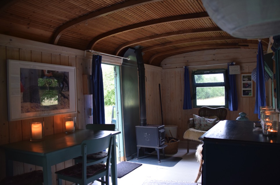 Der liebevoll eingerichtete, große Wagen (7m) und der kleinere, gemütliche Wagen (3m) stehen auf der Wiese bei den Hühnern, (6 Hennen und ein Hahn) die ab 8 Uhr auf Schneckensuche unterwegs sind.