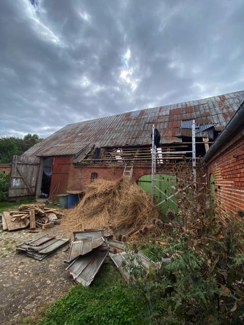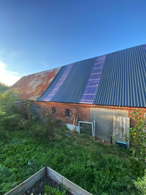Letztes Jahr haben wir uns zum Ende des Sommers an das Scheunendach herangewagt, jahrzehnte altes Stroh entsorgt, Balken erneuert und die Hälfte des Scheunendachs neu eingedeckt.