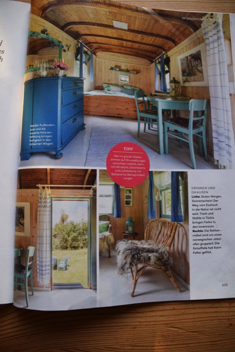 Der liebevoll eingerichtete, große Wagen (7m) und der kleinere, gemütliche Wagen (3m) stehen auf der Wiese bei den Hühnern, (6 Hennen und ein Hahn) die ab 8 Uhr auf Schneckensuche unterwegs sind.
